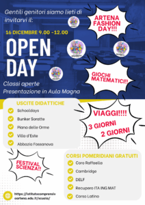 L’Open Day della SS1 Serangeli dell’I.C. Artena si svolgerà il 16 Dicembre dalle ore 10.00 alle ore 10.30 con la presentazione del PTOF in Aula Magna, dalle 10.30 alle 12.30 le classi saranno aperti per attività didattiche e laboratori.